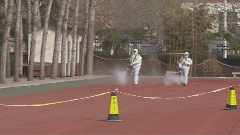 在青州市西苑小学核酸检测点,前来检测的市民在工作人员及志愿者的引导下,有序进入检测区。按照1米安全距离出示健康码、测量体温、登记信息后,进入核酸采样区。与此同时,猎鹰道路救援队的5名志愿者使用弥雾机、喷雾器等专业设备对现场进行消杀。志愿者严格按照规范要求,有序对核酸检测点地面、桌面、物体表面等进行喷洒消毒。