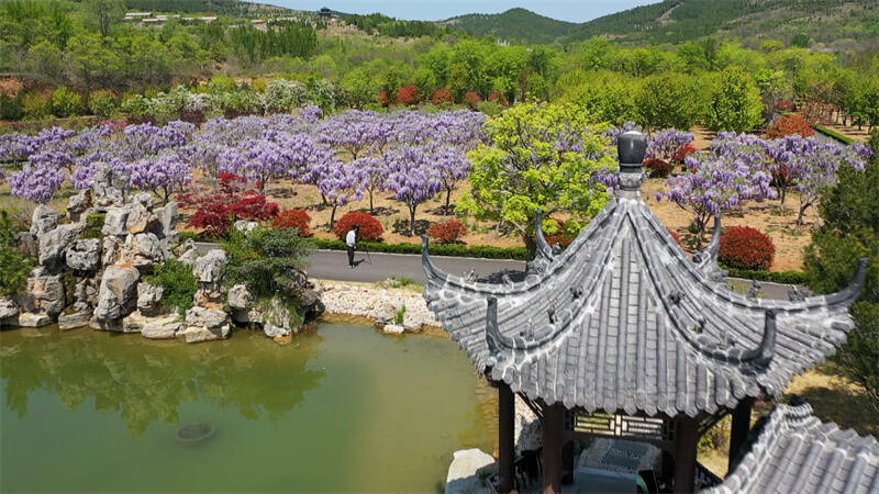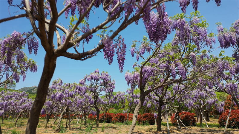 紫藤挂云木,花蔓宜阳春。紫藤,又称藤萝、朱藤,虽然长得像树,但它是藤蔓植物,茎杆具有缠绕性,是攀援缠绕性大藤本的优良观赏植物。花开时,一串串蝴蝶形状的花朵垂直向下,风一吹,随风飘动,别有韵致。眼下,在青州市九龙峪度假区的紫藤园内,近百棵正处在盛花期的紫藤,串串花朵悬挂于绿叶藤蔓之间,散发着淡淡香气,让人心旷神怡。