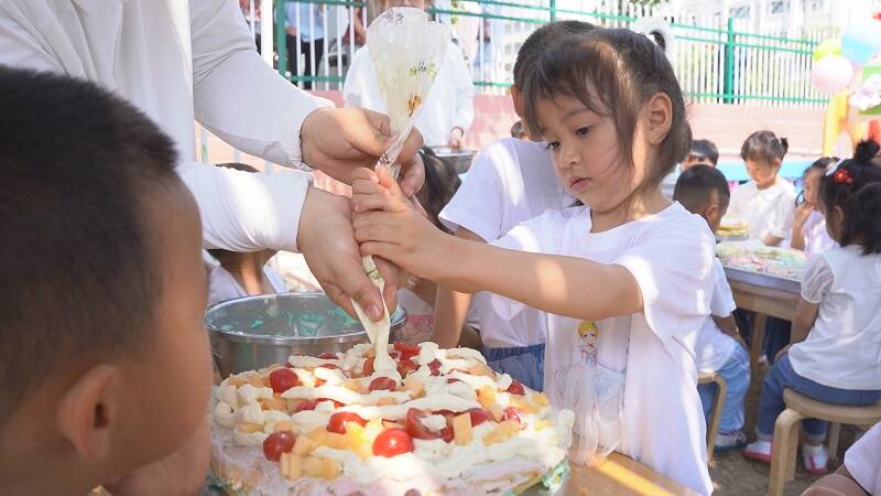 在幼儿园一角,一场蛋糕DIY制作活动正在举行。在老师的指导下,孩子们变身为小小蛋糕师,用水果进行蛋糕DIY,并刷上诱人的奶油。一双双灵巧的小手、一张张开心的笑脸,荡漾着“六一”的欢乐。
