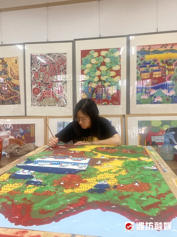 在中国青州农民画画院,画师王倩给新作品上色。
