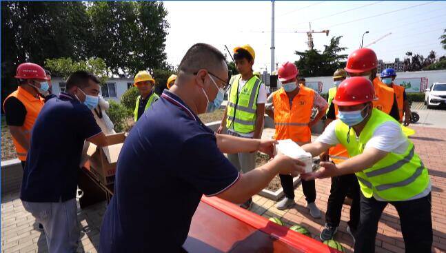 在中铁北京工程局青州市云门山棚户区改造工程项目部,“炎炎夏日送清凉 工会关怀沁人心”的主题慰问活动正在进行当中,工作人员为工友送上藿香正气水、凉茶、绿豆等防暑降温用品,为他们送去清凉,感谢他们的坚守。