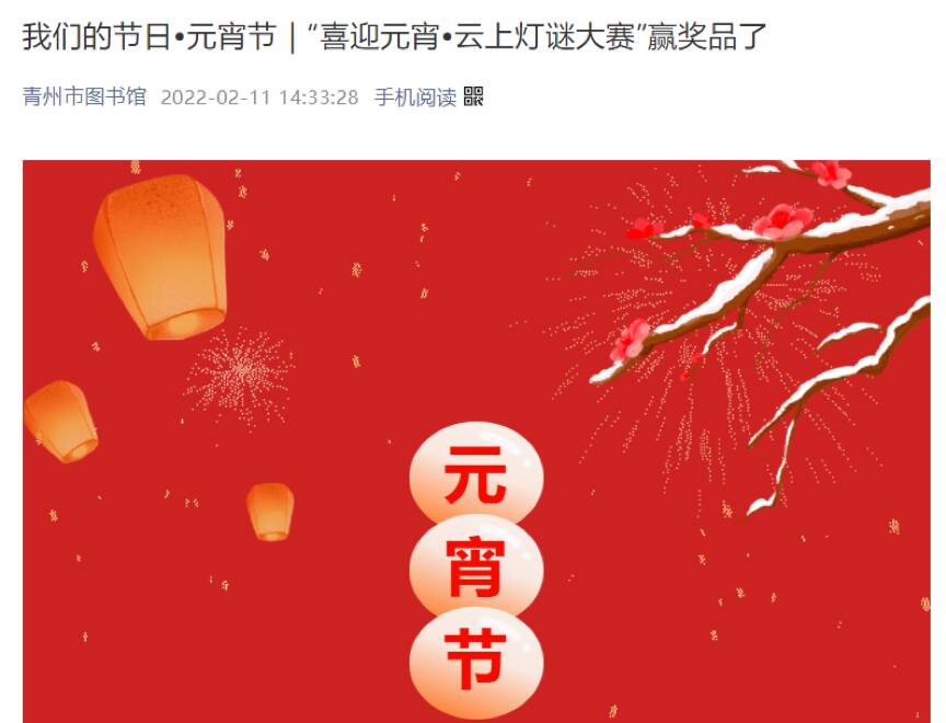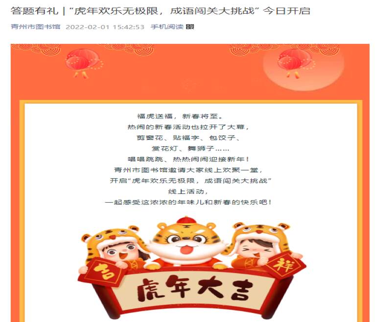 二、举办在线有奖竞赛,激发读者参与热情。“虎年欢乐无极限,成语闯关大挑战”、“我们的节日•元宵节|喜迎元宵•云上灯谜大赛”, “诗心不改,与你‘童’乐——六一儿童节线上诗词竞赛”等线上有奖竞答活动,极大激发了读者参与热情 。今年上半年青州市图书馆举办线上竞答活动12场次,吸引了4000余人次参与其中,让疫情期间的读者同样享受到精彩的阅读服务。另外,在线竞赛的开展,参赛者可以融入到理想的环境当中。如读书朗诵大赛活动,有读者到青州古城取景,让历史文化遗迹融入到朗诵当中,这是线下比赛中无法具有的。