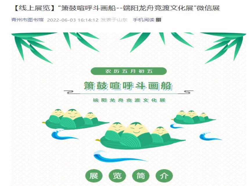 四、线上展览展示,实现开放式办展。青州市图书馆开展了“辞旧‘楹’新 翰墨迎春——古今名家楹联文化线上春节特展”、“文以聚心 艺起抗疫 ‖ 抗疫诗词作品展播”、“胶东五市独具一格的古籍方志中的地图文化联展”等活动全部实现在线展示,真正做到开放式办展。今年来,利用微信“云阅读 悦精彩”平台组织举办了13场线上展览,吸引众多读者参与,收到良好效果。
