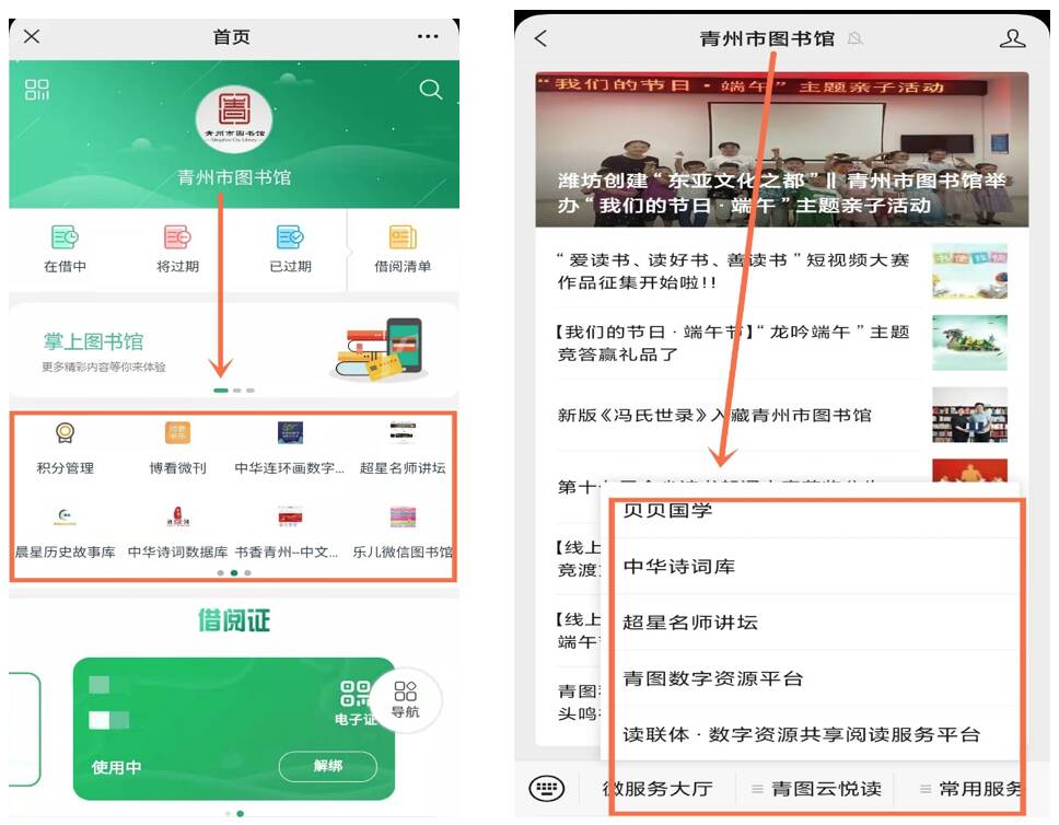 一、扩展在线数据库,丰富数字资源。青州市图书馆积极搭建数字阅读空间,“青图云悦读”弥漫浓浓书香。读者通过点击“青州市图书馆”微信公众号的微服务大厅即可进入该市图书馆的线上资源平台。目前,该平台共有“红色故事绘”、“中华古诗词”、“名师讲坛”等9类数据库,内容丰富、形式多样,适应当前移动化、数字化阅读新时尚,满足读者个性化、专业化阅读需求。