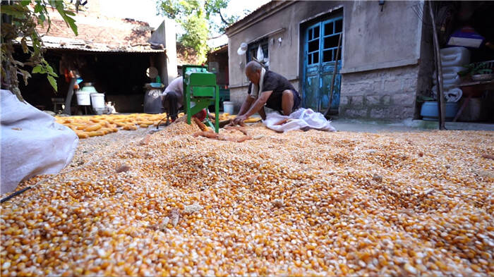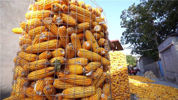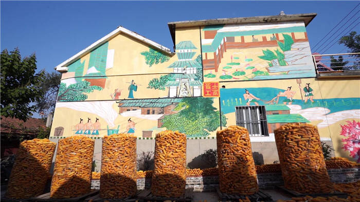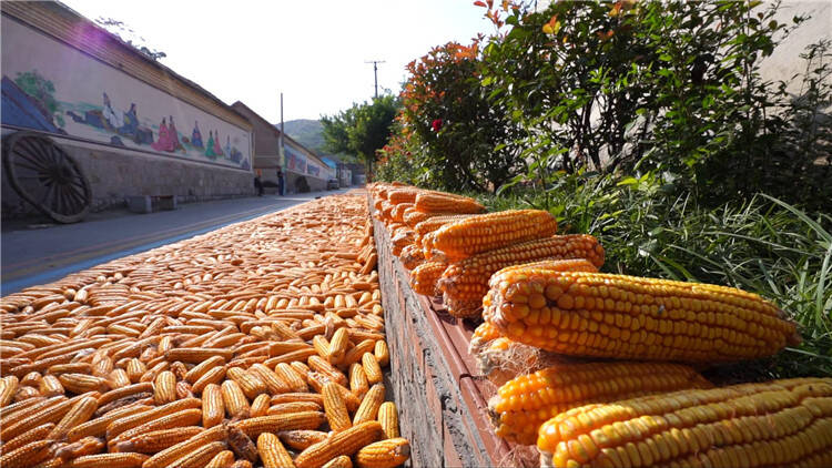 村庄内,喜获丰收的玉米或平摊于村内广场,或堆放于门前空地,或罗列在花坛边沿,或整齐铺在道路两侧,村民忙着晾晒、脱粒,喜悦的笑容,古风古韵的墙体画,饱满金黄的玉米构成了一幅让人心驰神往的乡村丰收画卷。