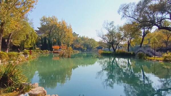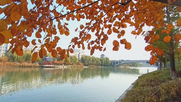 秋日的潍坊青州市南阳河景区,枫叶火红,银杏金黄,漫步河边,秋水如玉,碧空如洗,花草树木五彩斑斓,仿佛走进一条彩色画廊。
