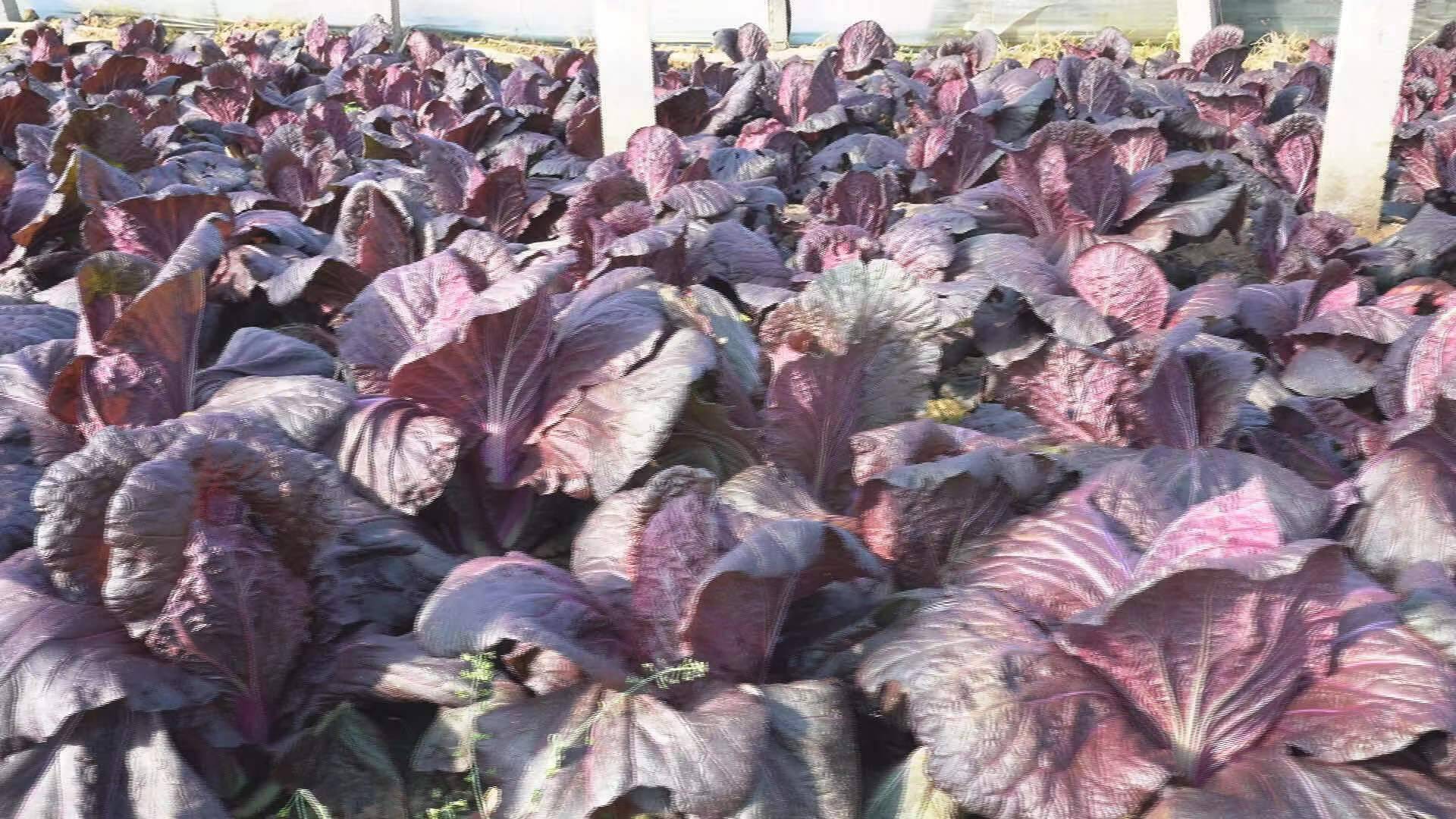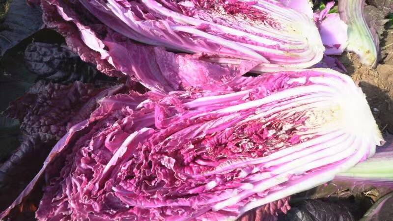 成熟的紫白菜外形与普通大白菜一样,呈直筒状,颜色上则是从外叶到菜心都是紫色。紫色白菜不仅有艳丽的外观和脆嫩的口感,而且营养价值丰富,花青素和维生素含量更高。菜农张克亮介绍,紫白菜销路旺、价格稳定,一亩地比普通白菜多收入五千余元。