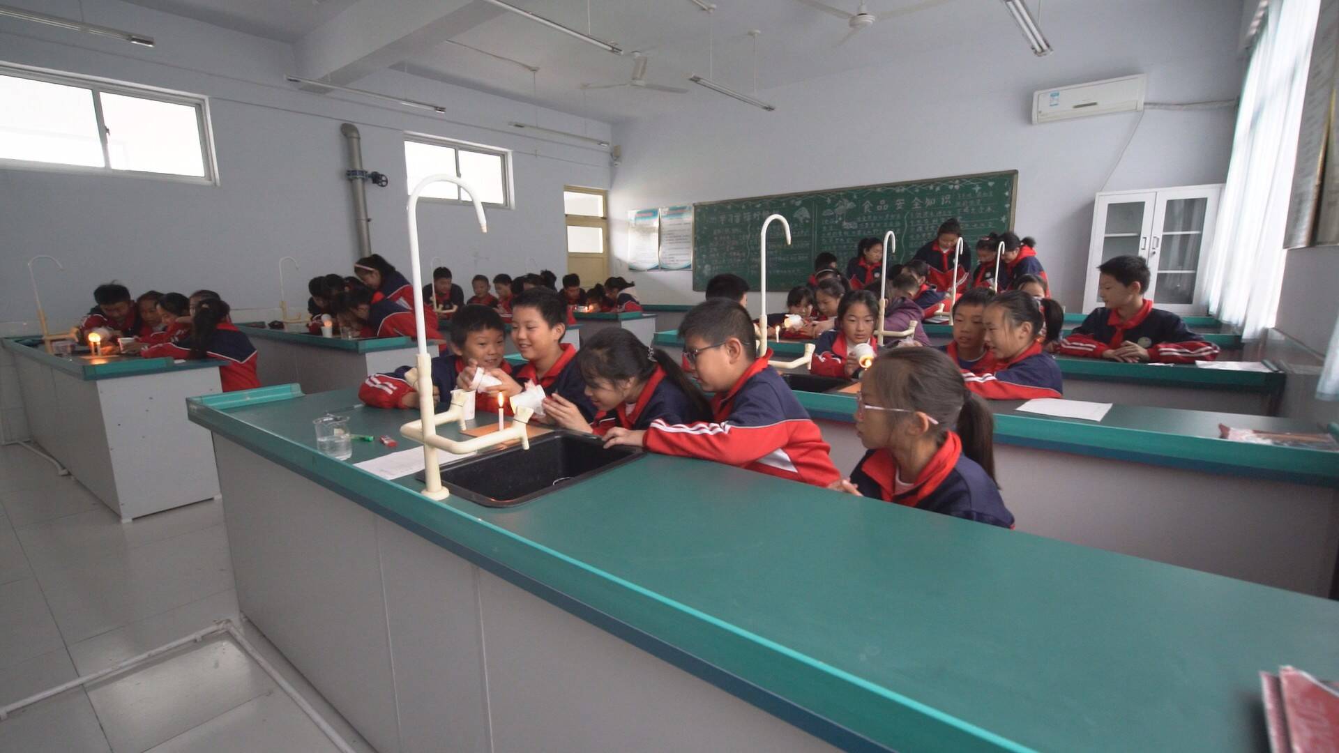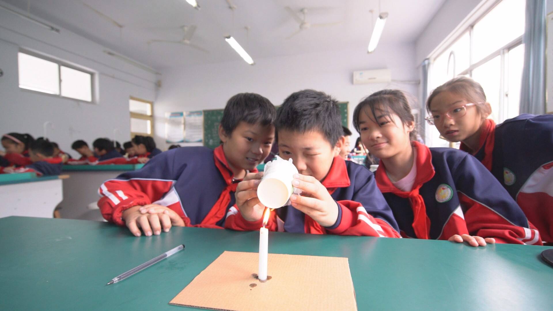 王府街道刘井小学教室里,老师利用一次性纸杯,塑料纸,蜡烛等材料带领同学们探究小孔成像的原理,同学们亲自动手操作,在纸杯开口的一端蒙上塑料纸,在纸杯底部戳一个小孔,将杯子有孔的一端靠近燃烧的蜡烛,通过改变杯子与蜡烛的距离,观察蜡烛成像的变化,在实验过程中,同学们也将科学知识牢记于心。