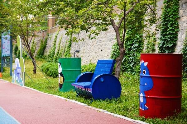 打造垃圾分类主题公园,提升城市“时尚气质”。对现有健身公园进行改造,在保留原有景观的基础上,将旧轮胎、油桶等废弃元素巧妙融入科学分类、循环利用和绿色环保的理念,增设科普宣传展板、创意景观小品、卡通主题打卡墙以及旧物利用改造空间,将垃圾分类宣传与景观设施有机结合,通过寄学于景、废物再利用的宣教方式,将垃圾分类知识融入街头公园之中,引导市民游客养成垃圾分类的文明习惯。